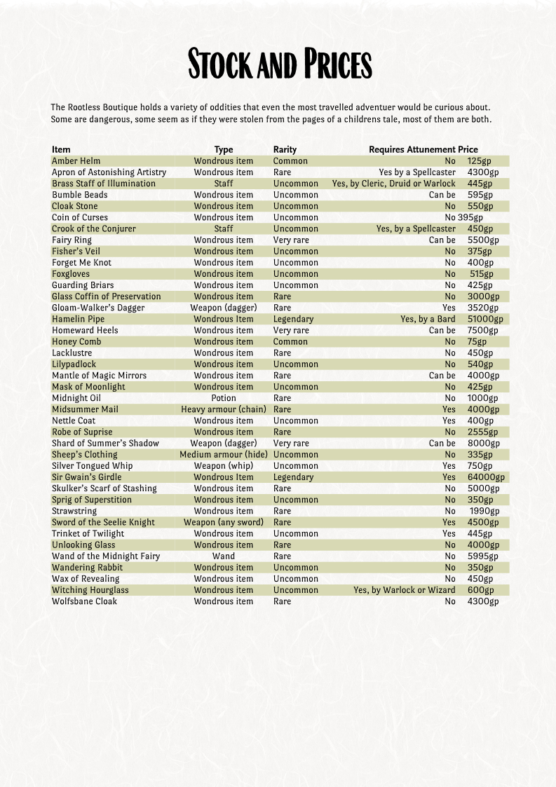 The Rootless Boutique is a travelling shop run by the mysterious Magwitch, a fey creature of unknown ability and an interest in the material plane.