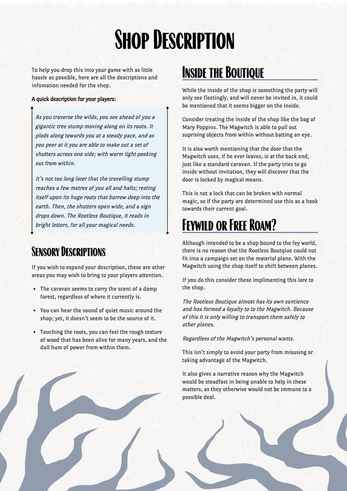 Drag and drop shops are here to help GMs out when the party inevitably asks if there’s anything interesting around. These will take the stress out of having to come up with somewhere on the fly and hopefully give your party a store that they will want to revisit time and time again. With NPCs, unique magic items, a shop map and more, never dread a spontaneous shopping trip ever again!
